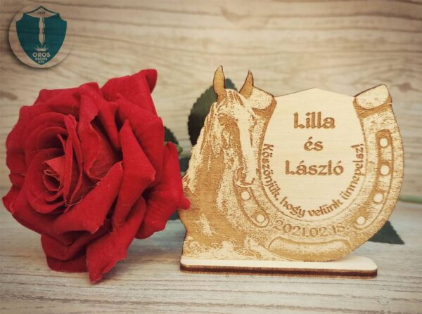 A lovak szerelmesei imádják ezt a különleges asztaldíszt. A dátum mellett a menyasszony és a vőlegény neve kerül a plakettre.