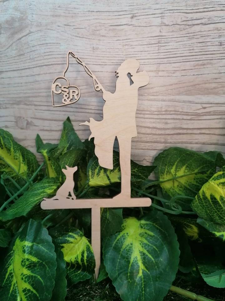 Horgászok nagy kedvence ez az egyedi monogramos tortadísz az esküvőn, hiszen mégis csak a legnagyobb fogást szimbolizálja.
