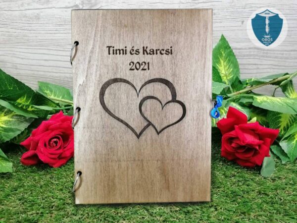 Saját nevetekkel gravírozott szivecskés fotóalbum, választható lapszínekkel.